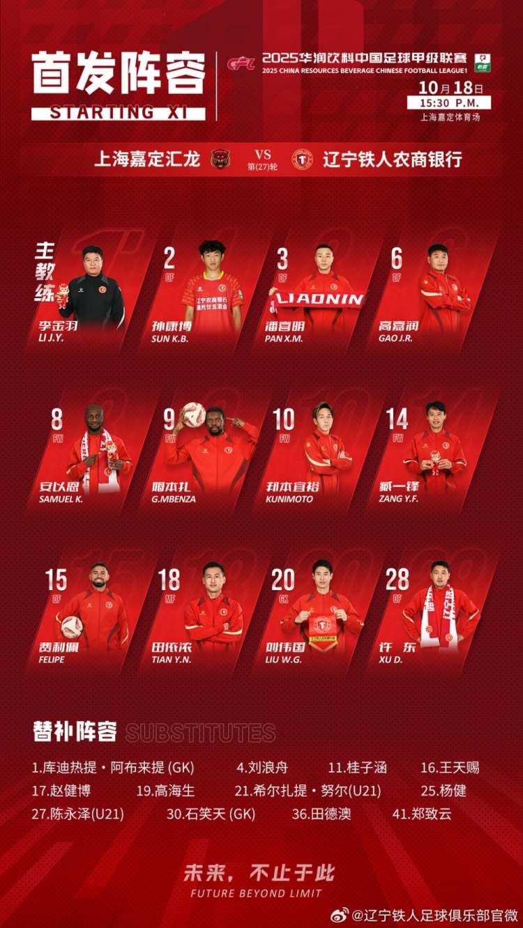 2025-10-18 16:01:38辽宁铁人今日首发名单!